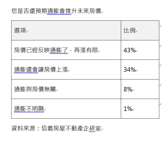 至於通膨影響部分,43%認為房價已經反映通膨,再漲有限,顯示相對多數人雖有感通膨壓力,但也體認到過去一段時間,房價已經充分反映通膨而上揚,通膨恐難再支撐房價持續走揚,但也有34%受訪者認為通膨還會讓房價上揚。
