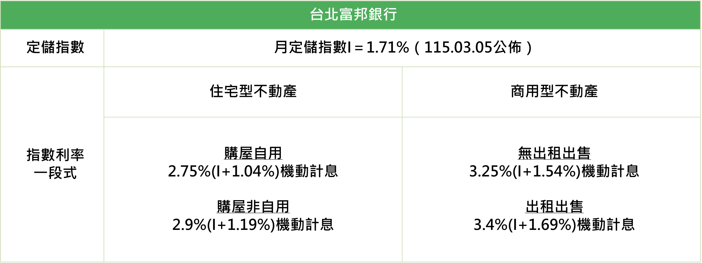 2.此利率係為分期攤還型房貸,「限制提前清償」利率(限制清償期間為三年),若選擇「得隨時清償」其利率於貸款期間前3年須再加碼1.0%。